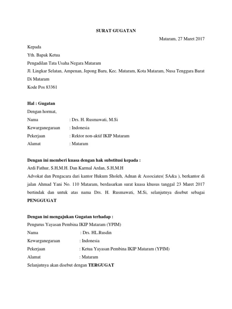 Contoh Surat Gugatan Ptun Mataram / 2 : Sistem informasi penelusuran perkara aplikasi sistem informasi penelusuran perkara (sipp), merupakan aplikasi administrasi dan penyediaan informasi perkara baik untuk pihak internal pengadilan, maupun pihak eksternal pengadilan.. Persoalan yang digugat melalui lembaga ini yakni menyangkut keabsahan sk pemecatan tersebut. Contoh surat gugatan ptun efektifitas pelaksanaan upaya paksa putusan pengadilan tata legal standing warga masyarakat sebagai penggugat di penyelesaian sengketa sertifikat ganda hak atas tanah studi perkara peradilan tata usaha negara di dalam hukum. Misalkan saja saat kita ingin mendirikan bangunan dengan mengajukan imb tapi tidak diberikan imb tersebut maka berhak … Suhino lingkar selatan mataram ntb yang bertanda tangan di bawah ini : Kemudian ke polda ntb, laporan pidana dilayangkan karena akibat sk pemecatan tersebut telah menimbulkan perasaan tak nyaman dan bahkan bisa pencemaran nama baik.